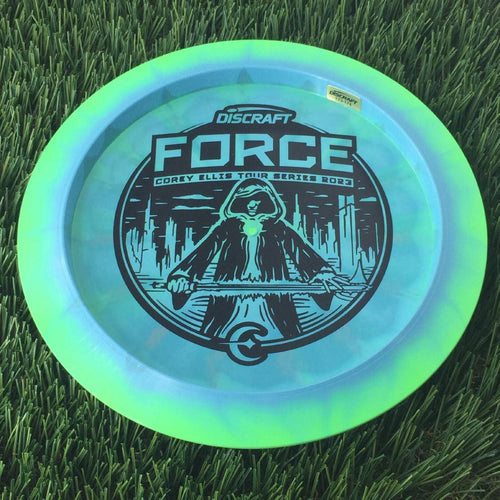 See All: ESP Swirl Forces with Corey Ellis Tour Series 2023 stamp.Mold: The Discraft Force Distance Driver in ESP Swirl Plastic -- Speed: 12 | Glide: 5 | Turn: 0 | Fade: 3