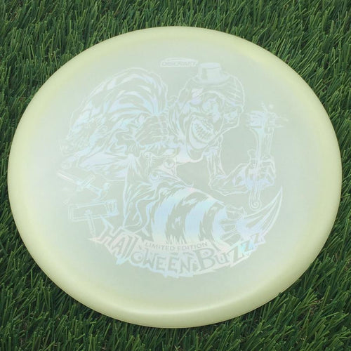 The Single-Foil Mega-Glo Halloween Buzzz turns darkness into its stage. Made from our popular Mega-Glo blend, this disc shines brighter and longer than any glow disc we’ve ever made. A minimalist single-foil stamp lets the unsettling clown artwork glow through the night—perfect for glow leagues or collectors seeking the most luminous Halloween Buzzz to date! See All: Mega-Glow Buzzzs with 2025 Halloween Single Foil Art by Brian Allen stamp.