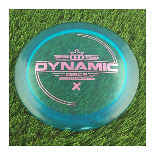 See All: Lucid Ice Trespasss with Ten-Year Anniversary 2012-2022 stamp.Mold: The Dynamic Discs Trespass Distance Driver in Lucid Ice Plastic -- Speed: 12 | Glide: 5 | Turn: -.5 | Fade: 3