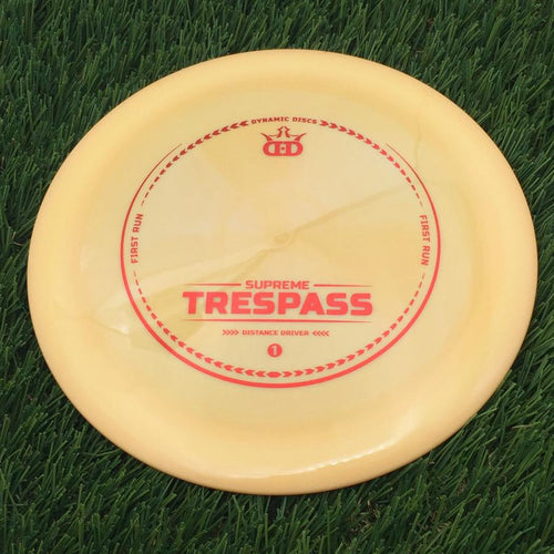 See All: Supreme Trespasss with First Run stamp.Mold: The Dynamic Discs Trespass Distance Driver in Supreme Plastic -- Speed: 12.0 | Glide: 5.0 | Turn: -0.5 | Fade: 3.0