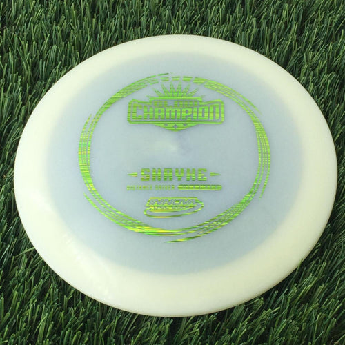 The Champion Shryke is an easy to throw, very long range driver for a wide variety of players. It has a little less turn than a regular Shryke. A mild high speed turn puts the Shryke in glide mode, which along with its high aerodynamic speed, give it incredible distance. The low speed fade is also mild, which makes it easy to keep on the fairway.