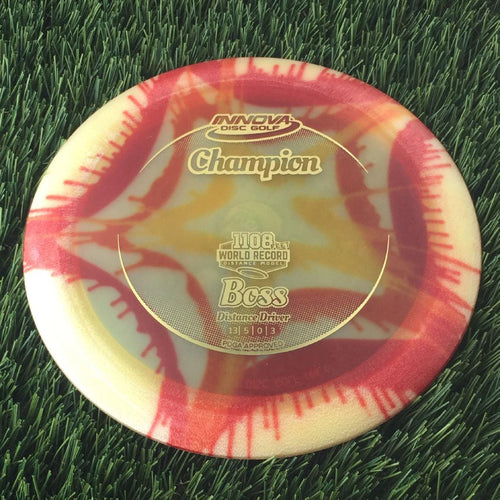 Mold: The Innova Boss Distance Driver in Champion I-Dye Plastic -- Speed: 13 | Glide: 5 | Turn: -1 | Fade: 3