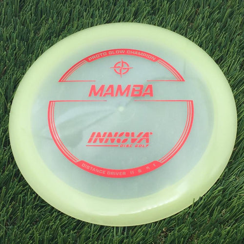 Mold: The Innova Mamba Distance Driver in Proto Glow Champion Plastic -- Speed: 11.0 | Glide: 6.0 | Turn: -5.0 | Fade: 1.0