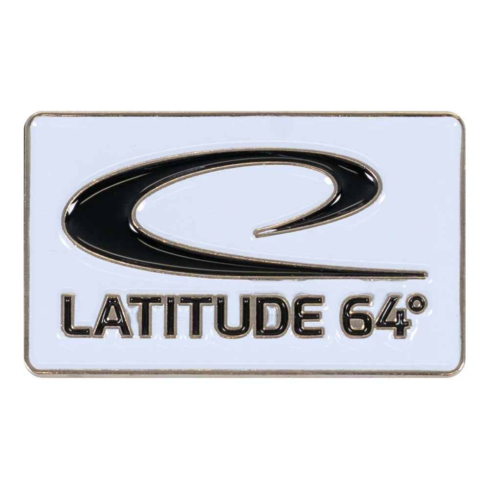 Rectangular white Latitude 64 lapel pin with black swoosh logo and text, surrounded by a subtle golden border.