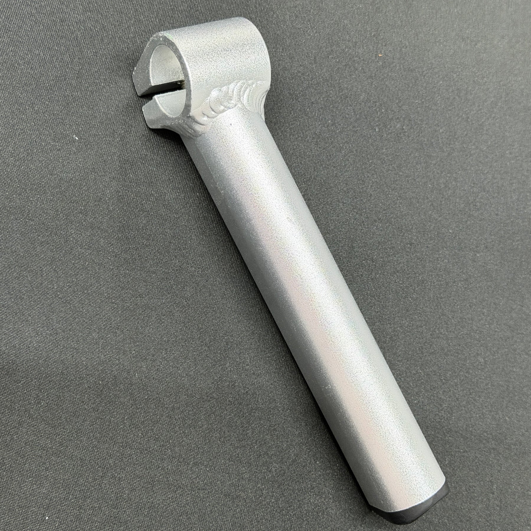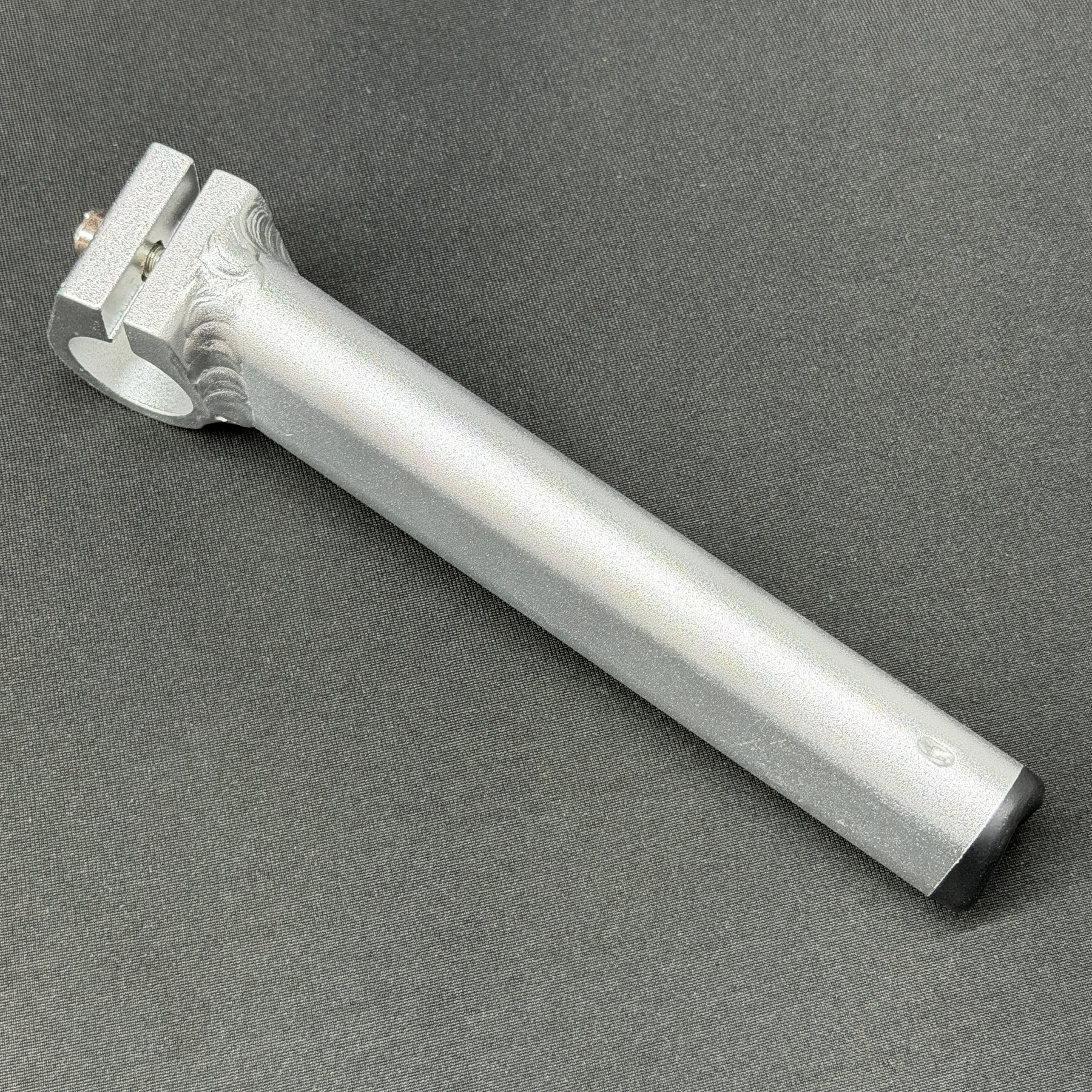 Light silver Zuca handle bar cart attachment with a black rubber end and U-shaped clamp.