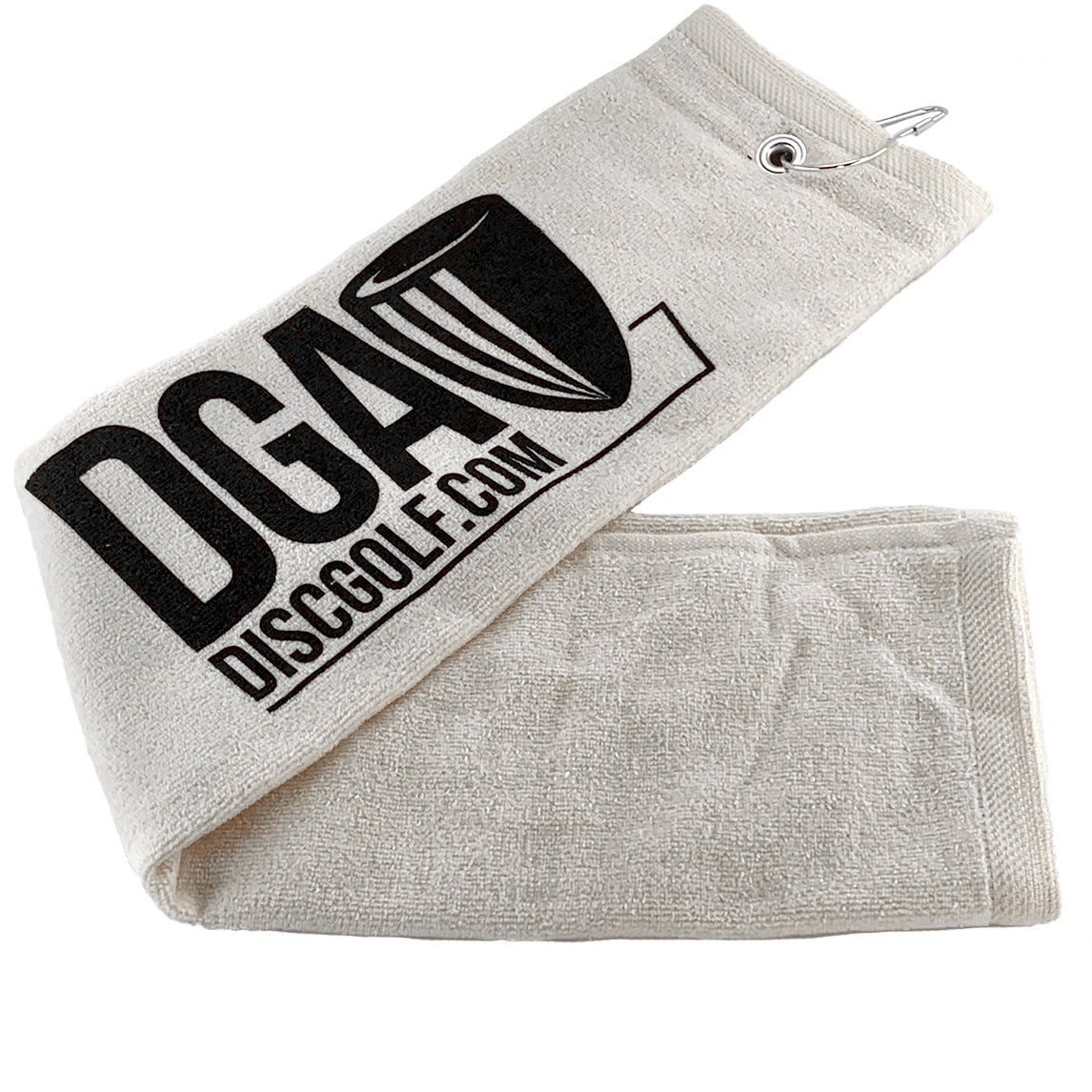 Off-white DGA disc golf tri-fold towel with a black logo, silver grommet, and carabiner clip.