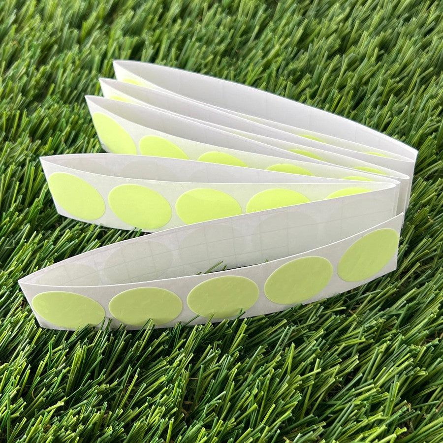 Several rolls of 1-inch dzdiscs glow dots with neon yellow circular stickers on white backing paper.