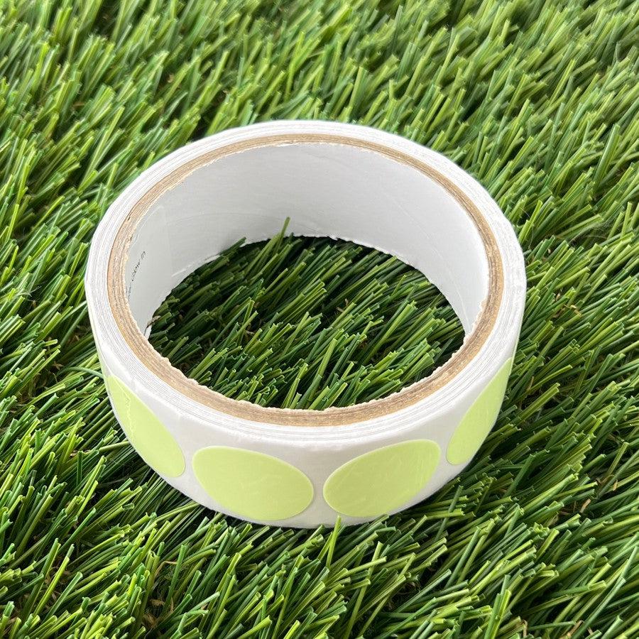 A white roll of one inch dzdiscs glow dots with light green circular stickers visible on the side.