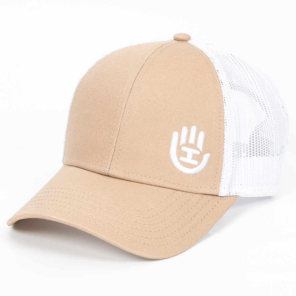 Beige and white Handeye Brand snapback hat with a white Handeye logo embroidered on the front panel.