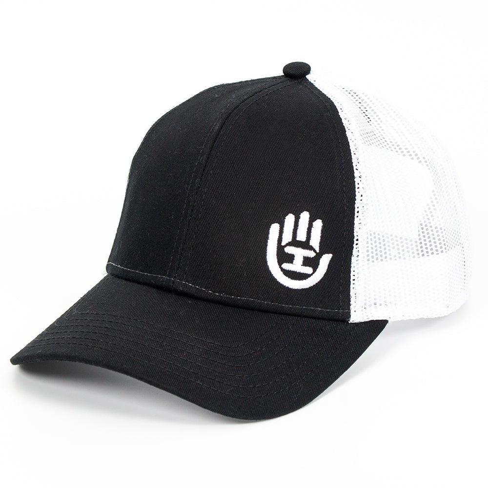 Black and white Handeye snapback hat with a solid front panel, white mesh back, and an embroidered Handeye logo.