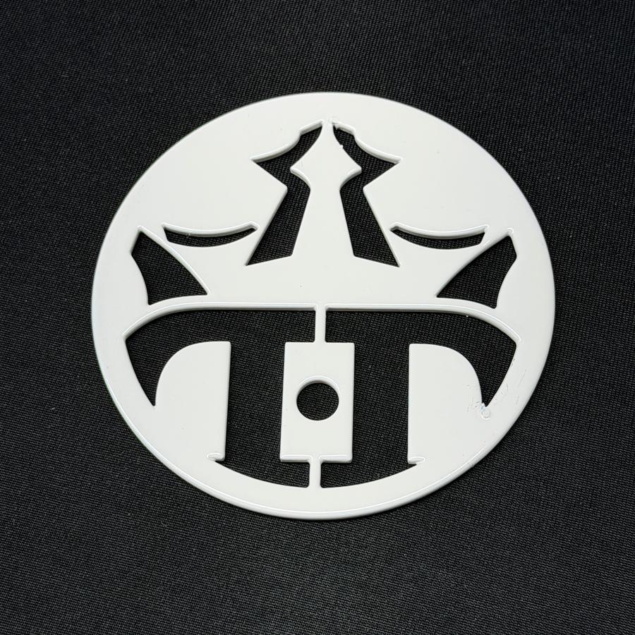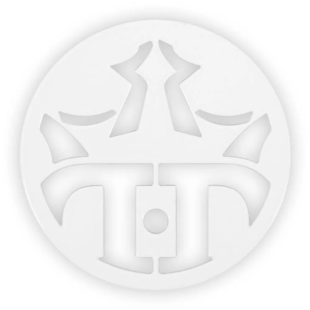 The symmetrical design is cut directly out of the metal rather than printed, creating a precise, die cut look that is white on both sides. A centered mounting hole adds versatility, allowing the marker to be bolted onto a cart, bag, sign, or other gear if you want to keep it easily accessible or use it as a display piece.