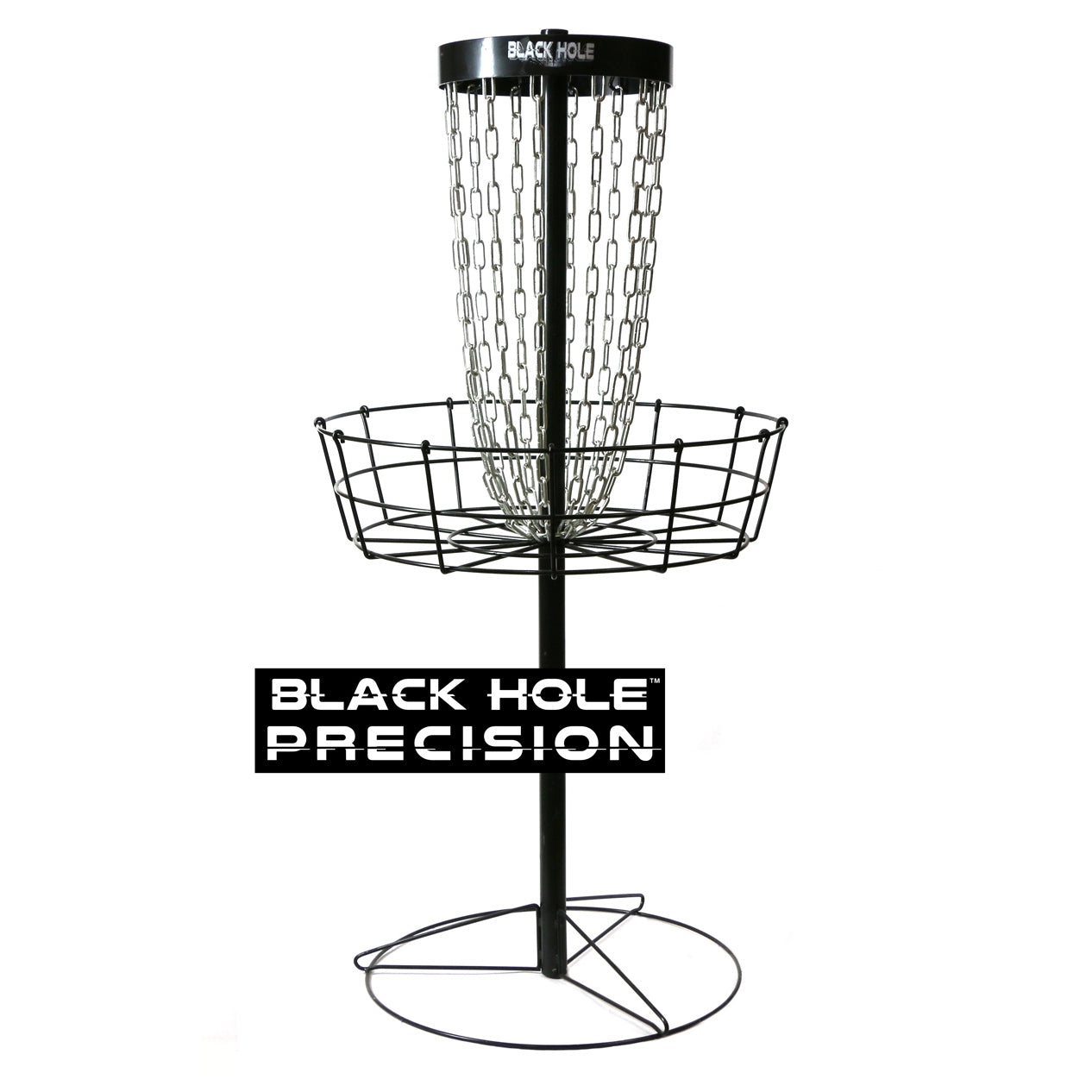 MVP Black Hole Precision disc golf basket with a circular metal basket, black pole, and silver chains.