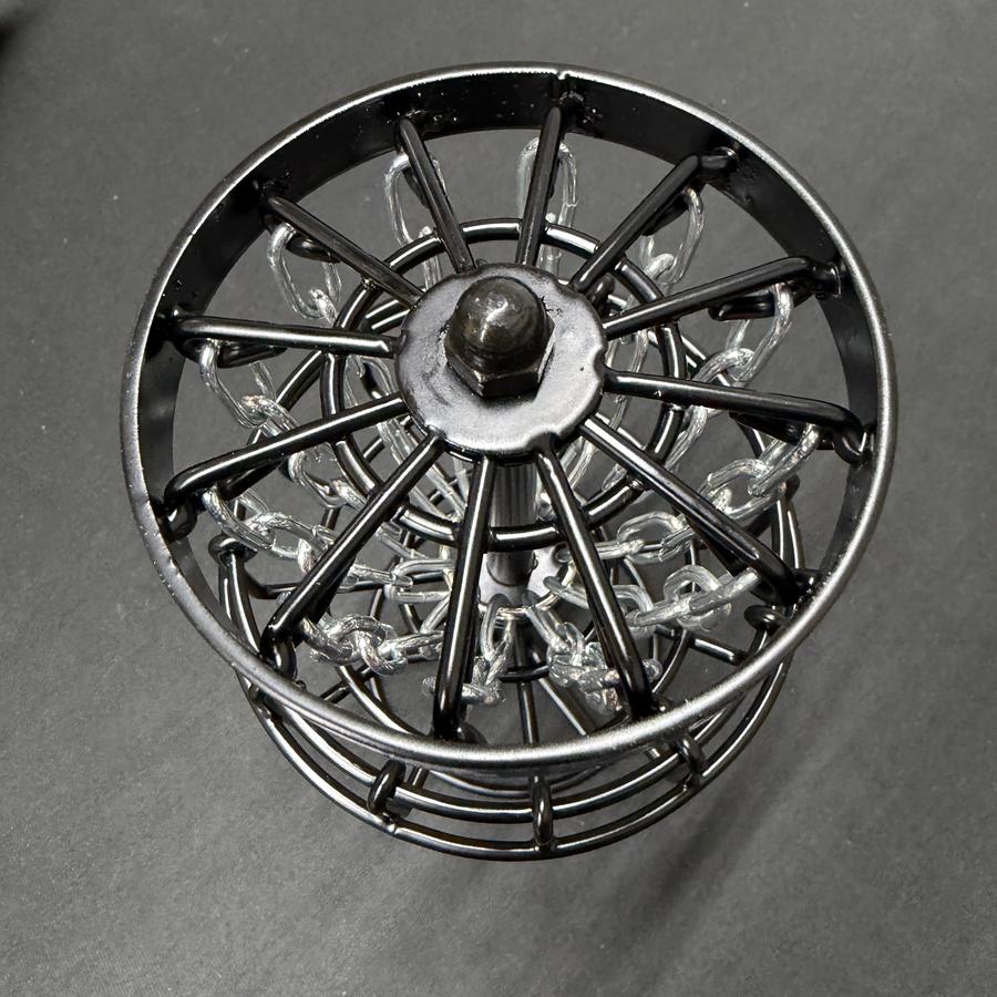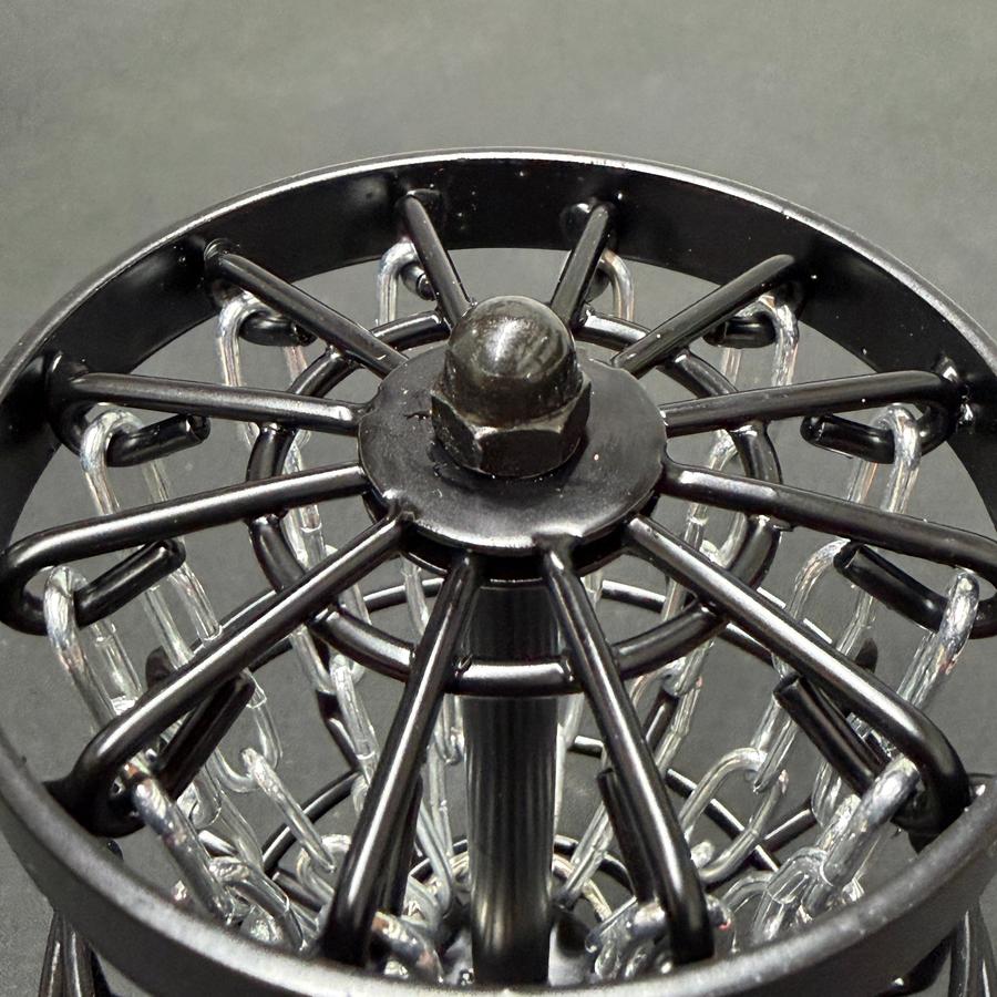 The Black Hole Micro Basket is a miniature metal disc golf basket that brings the look and feel of a full-size target straight to your desk. Standing at roughly 6 inches tall, this tiny basket features true-to-life proportions with a sturdy three-leg base, a thick top band, and a single layer of 12 steel chains. It arrives fully assembled, but the top bolt allows you to disassemble it if desired.