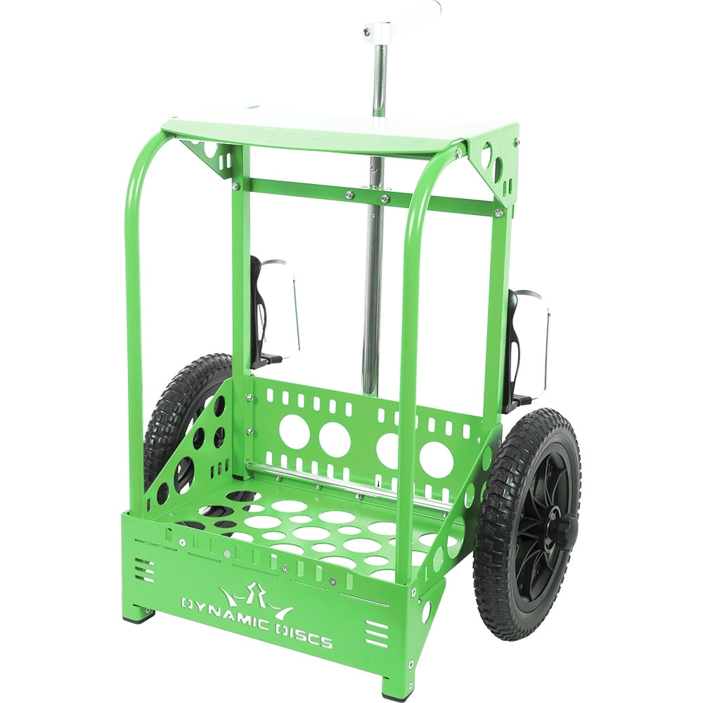 A bright green zuca dynamic discs large backpack cart with black wheels against a white background, featuring "dynamic.