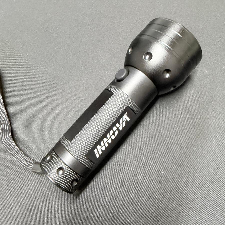 The flashlight uses 51 LED bulbs producing 5 watts of UV power. It runs on three AAA batteries, which are not included. A wrist strap comes preattached, useful for hanging the light if needed, though the connection point is thin and not intended for heavy carrying. The black anodized aluminum body features four beveled grip sections along with additional textured knurling, making it comfortable and secure in the hand. With both a flat top and flat bottom, it stands upright in either direction. The Innova Burst logo is printed along the side for a clean, branded look.