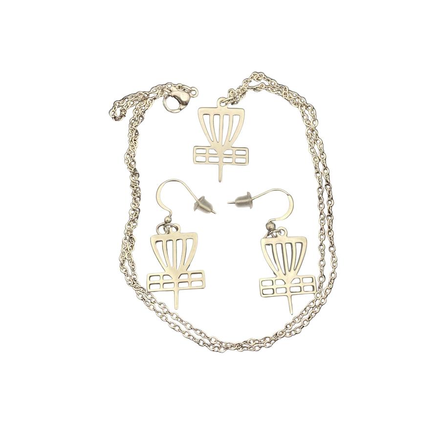 This polished stainless-steel jewelry set from Carbella Designs brings disc golf style into everyday wear with a clean, modern shine. The set includes matching earrings and a necklace, each featuring the same detailed disc golf basket charm. All three pieces use the identical charm—roughly ¾" to 1" tall and about ¾" wide—giving the set a unified, elegant look.