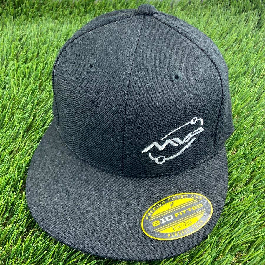 Casquette ajustée Flexfit Premium 210 en mélange de laine de qualité supérieure à bord plat de style baseball avec le logo blanc MVP Orbit brodé sur le panneau avant gauche et « The Leading Edge » brodé sur le dos.