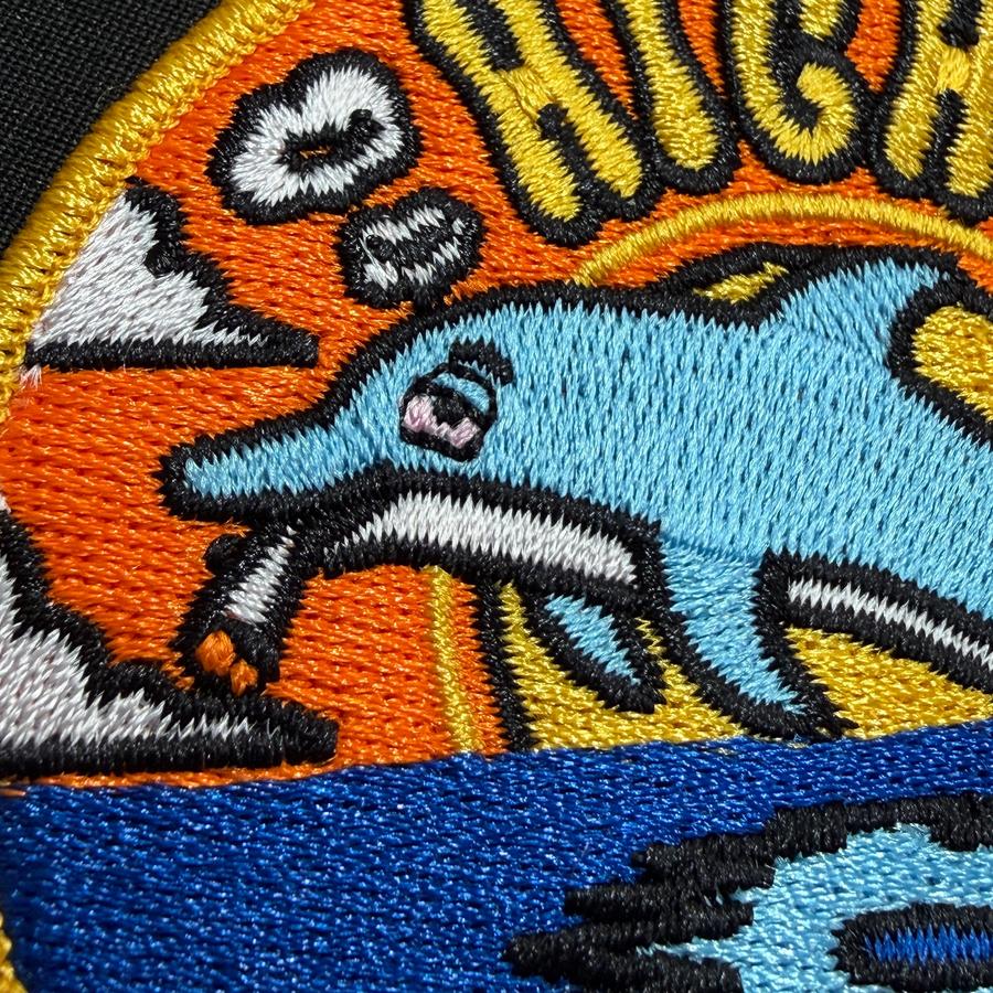 This Retrograde Supply Co circular patch is pure laid-back chaos in the best way possible. Featuring the text “High Tide,” the design shows a dolphin leaping out of the ocean at sunset, mid-air and puffing on a doobie. It is bold, playful, and unapologetically Retrograde.