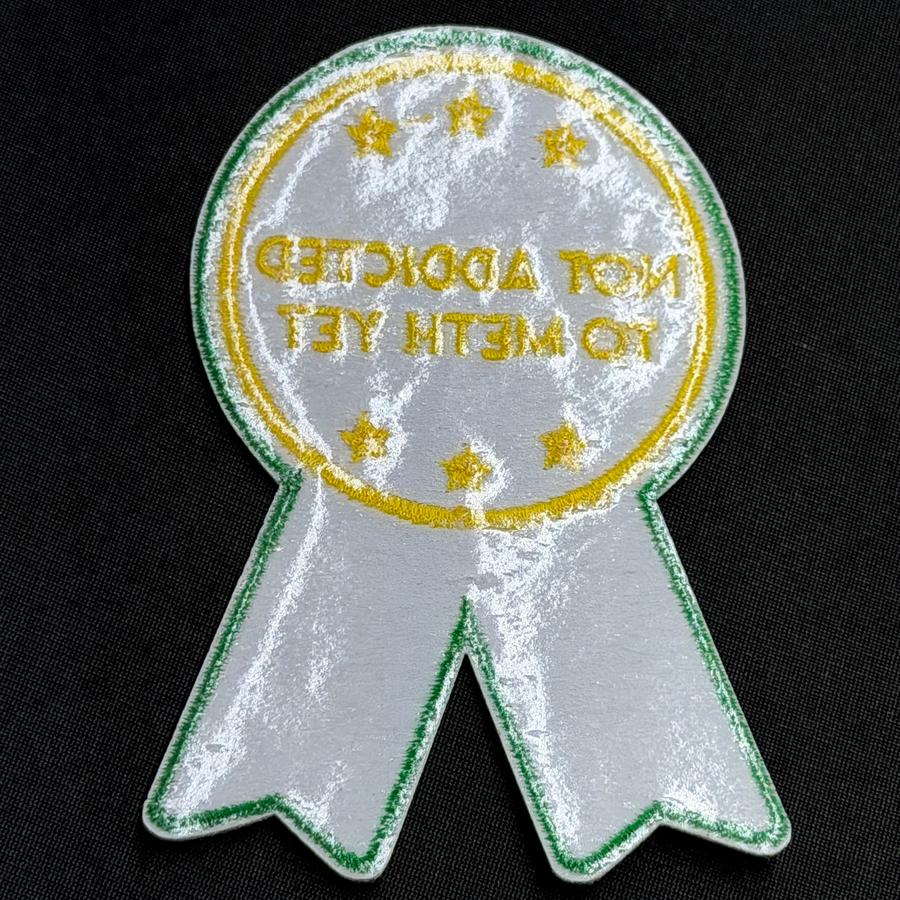 This Retrograde Supply Co award ribbon patch turns dark humor into a badge of honor. Styled like a classic award ribbon, this patch proudly reads “Hey, not addicted to meth yet,” delivering the kind of sharp, self-aware humor Retrograde is known for.