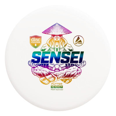 White Discmania Active Base Level Maestro disc golf mid-range disc with a blue bucket base and black graphics.