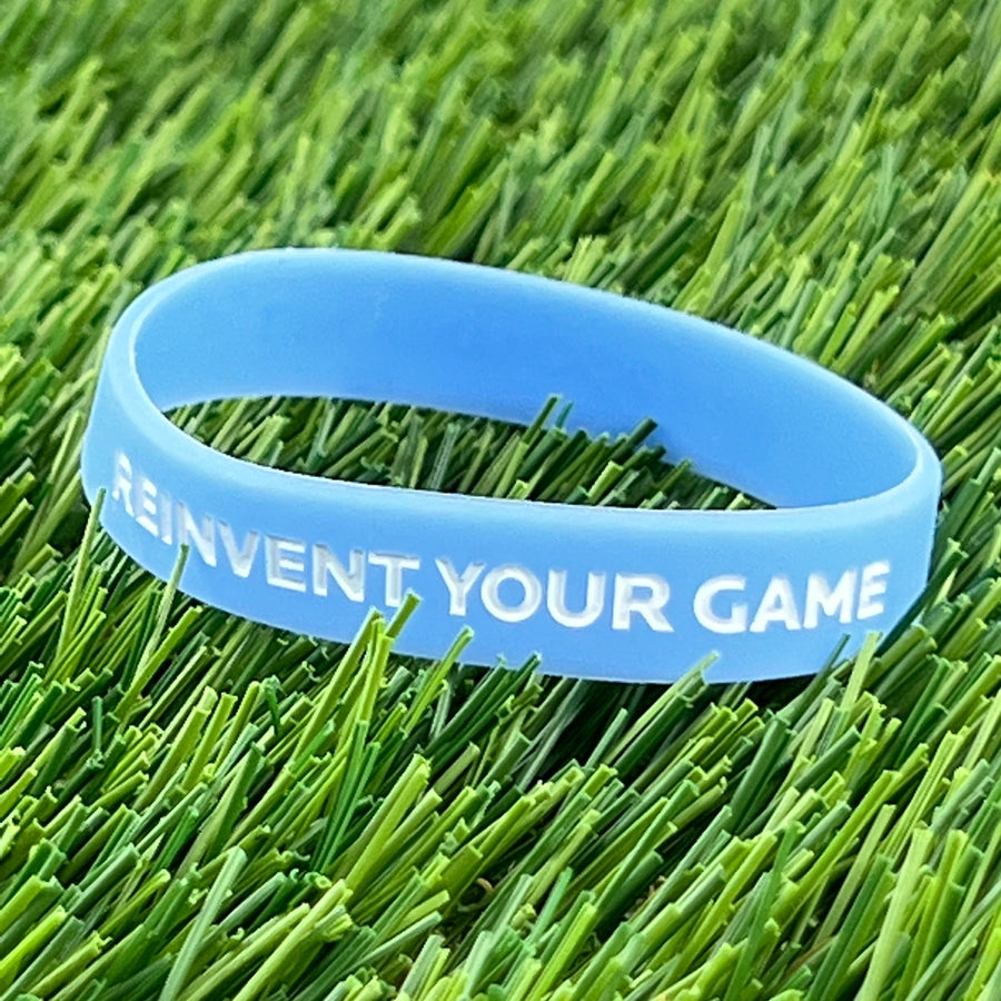 Light blue Discmania Reinvent Your Game silicone wristband with white embossed text.