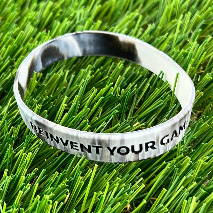 Discmania “REINVENT YOUR GAME” white silicone wristband with bold black lettering on a textured surface.