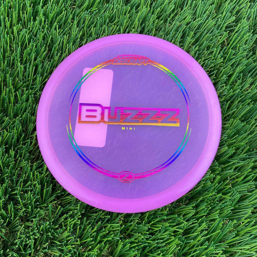 Translucent purple Discraft Mini Elite Z Buzzz marker disc with rainbow foil stamping and a large white label.
