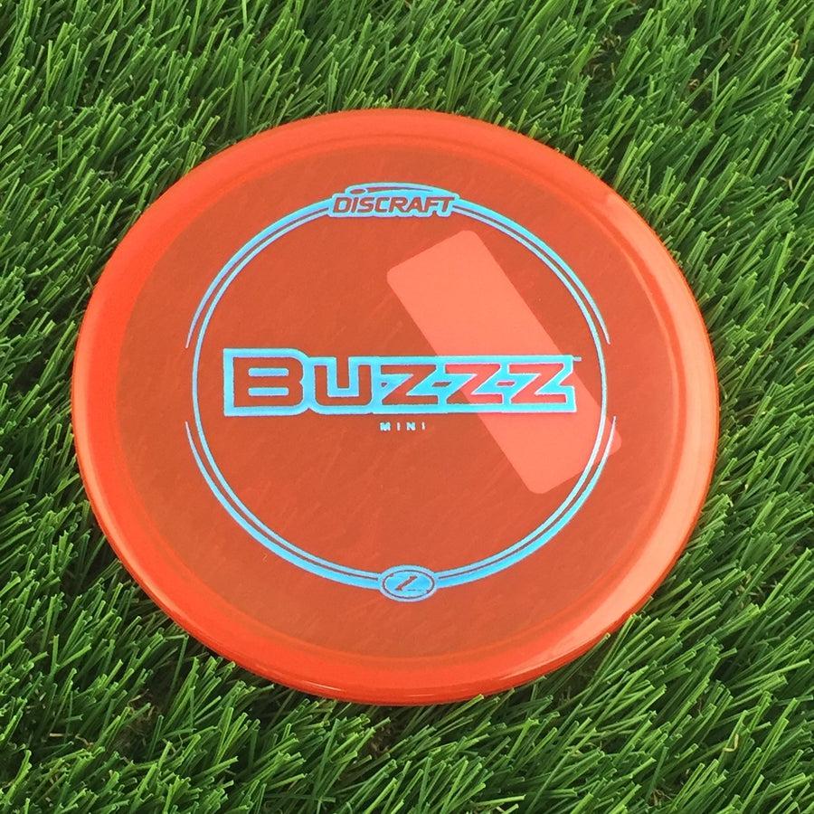 Round transparent orange Discraft Mini Buzzz marker disc with "Buzzz" text and blue rings.