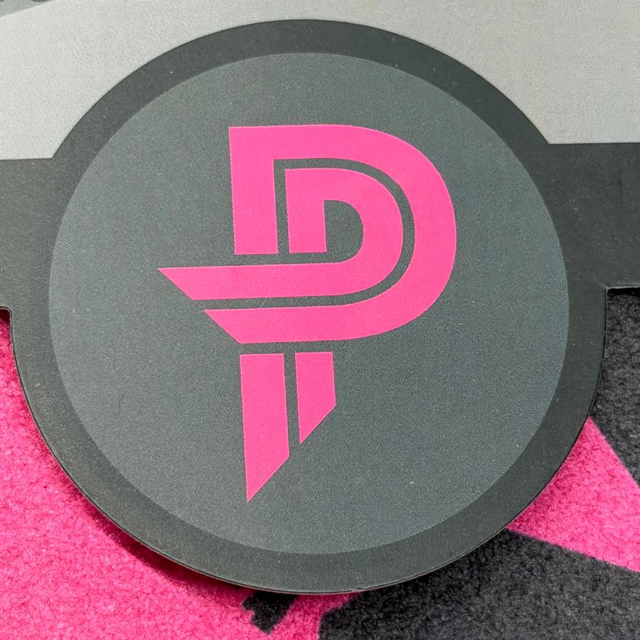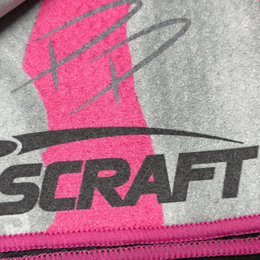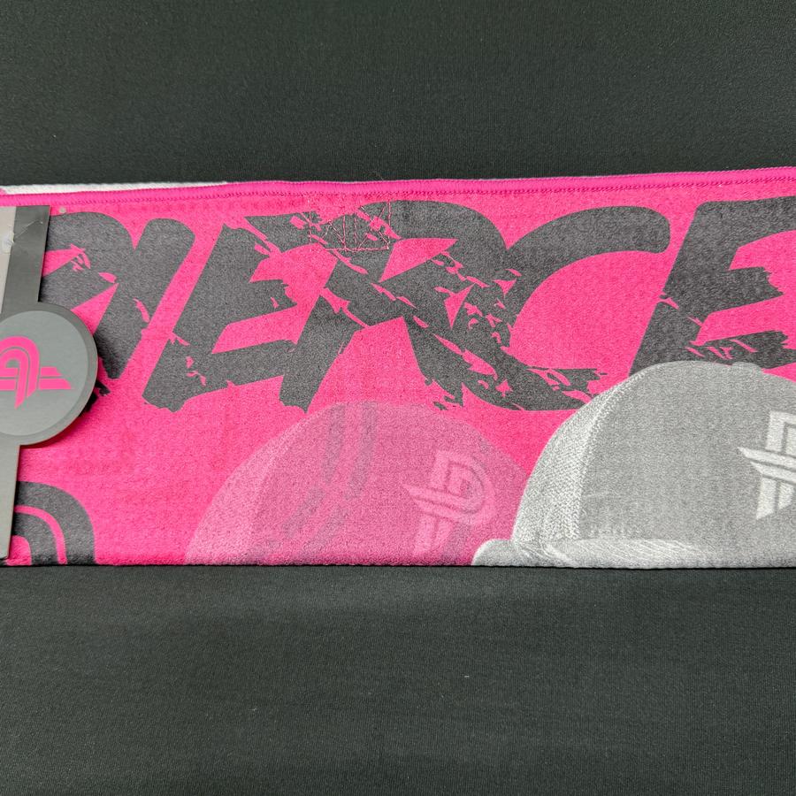 Vibrant pink and blue Paige Pierce Discraft microfiber towel with a graphic of Paige Pierce throwing a disc.