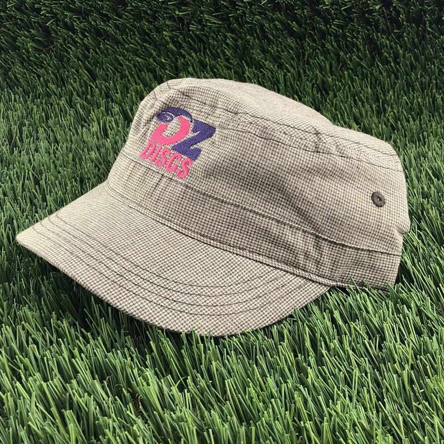 Black and white pinstripe military hat with a purple "OZ" and pink "DISCS" embroidered logo on the front.
