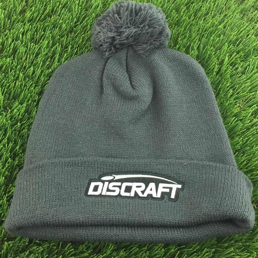 Dark gray knit Discraft embroidered logo cuff pom beanie with a matching gray pom on top.