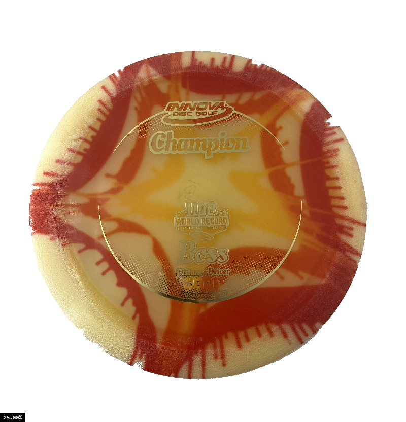 Mold: The Innova Boss Distance Driver in Champion I-Dye Plastic -- Speed: 13 | Glide: 5 | Turn: -1 | Fade: 3