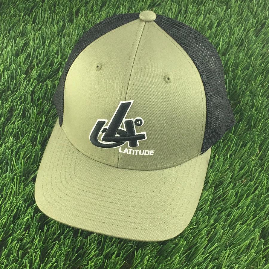 Olive green and black Latitude 64 fitted trucker hat with a white "LATITUDE" logo underneath a stylized L.