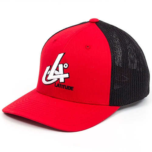 Red Latitude 64 fitted trucker hat with a white and black embroidered logo on the solid red front panel and black mesh back.