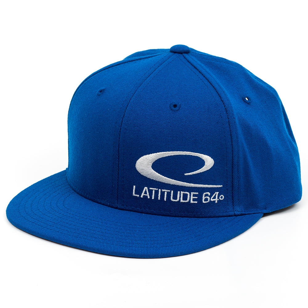 Blue Latitude 64 flat bill snapback hat with white embroidered brand logo and name on the front.