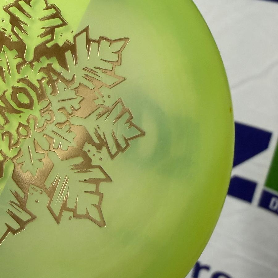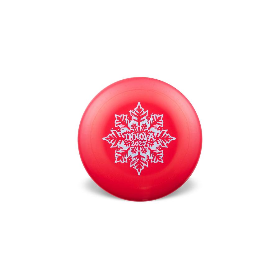 This mini marker comes in a slightly larger than standard size, measuring just under four inches across, making it PDGA legal for marking your lie during play. The 2025 holiday design features an eight pointed snowflake graphic paired with a 2025 stamp, creating a clean, festive look.