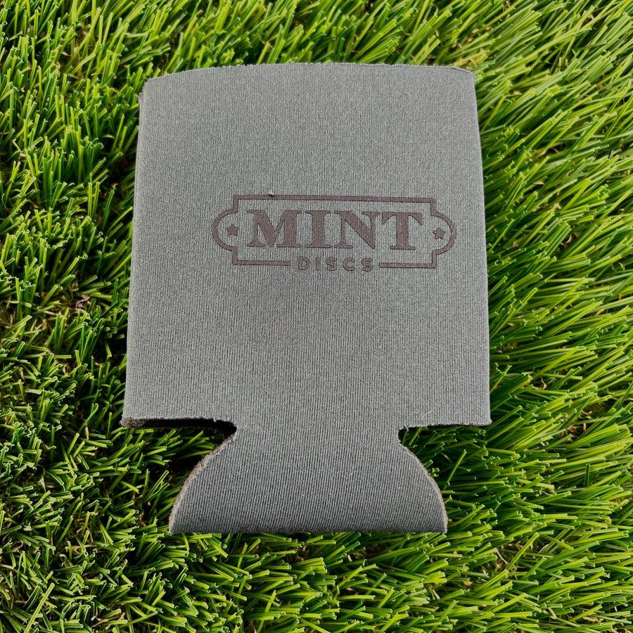 Gray neoprene beverage koozie featuring the "mint discs" logo, resting on vibrant green artificial turf.