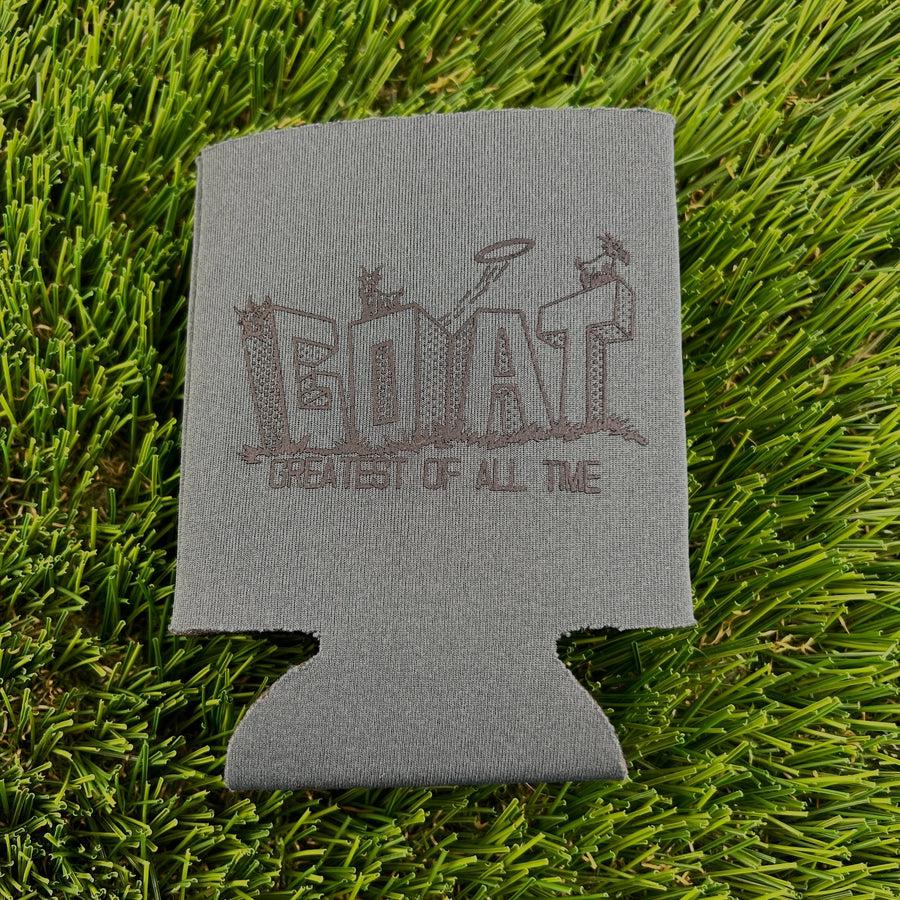 Mint green neoprene koozie with a brown "GOAT" text design and "GREATEST OF ALL TIME" below it.
