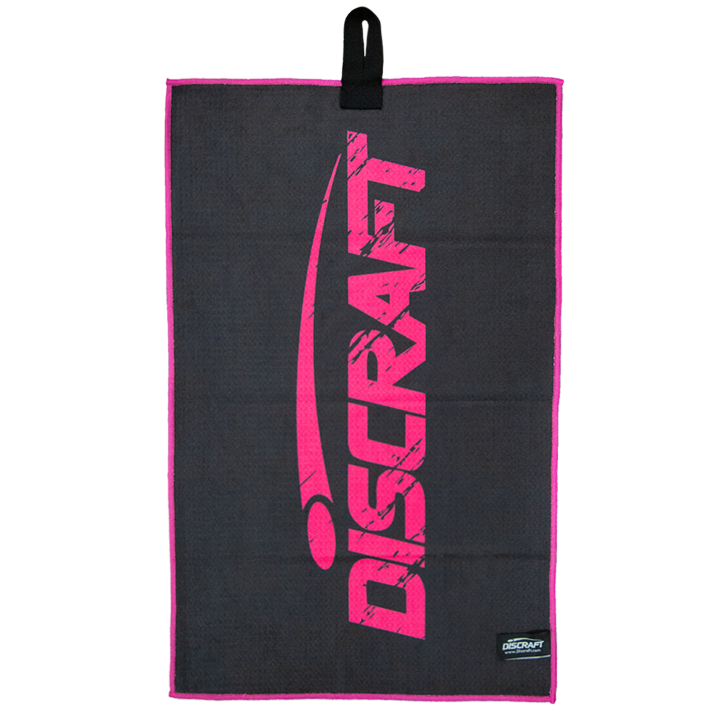 Black Discraft Paige Pierce microfiber towel with a large vertical hot pink Discraft logo and pink trim.