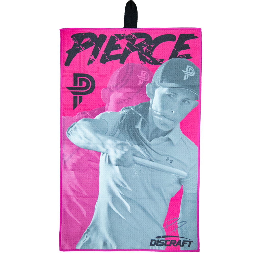 Vibrant pink and blue Paige Pierce Discraft microfiber towel with a graphic of Paige Pierce throwing a disc.