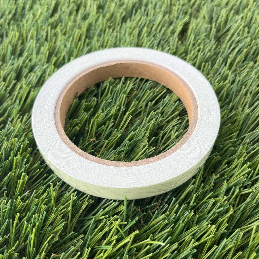White self-adhesive glow tape rolled on a brown cardboard core, lying diagonally.