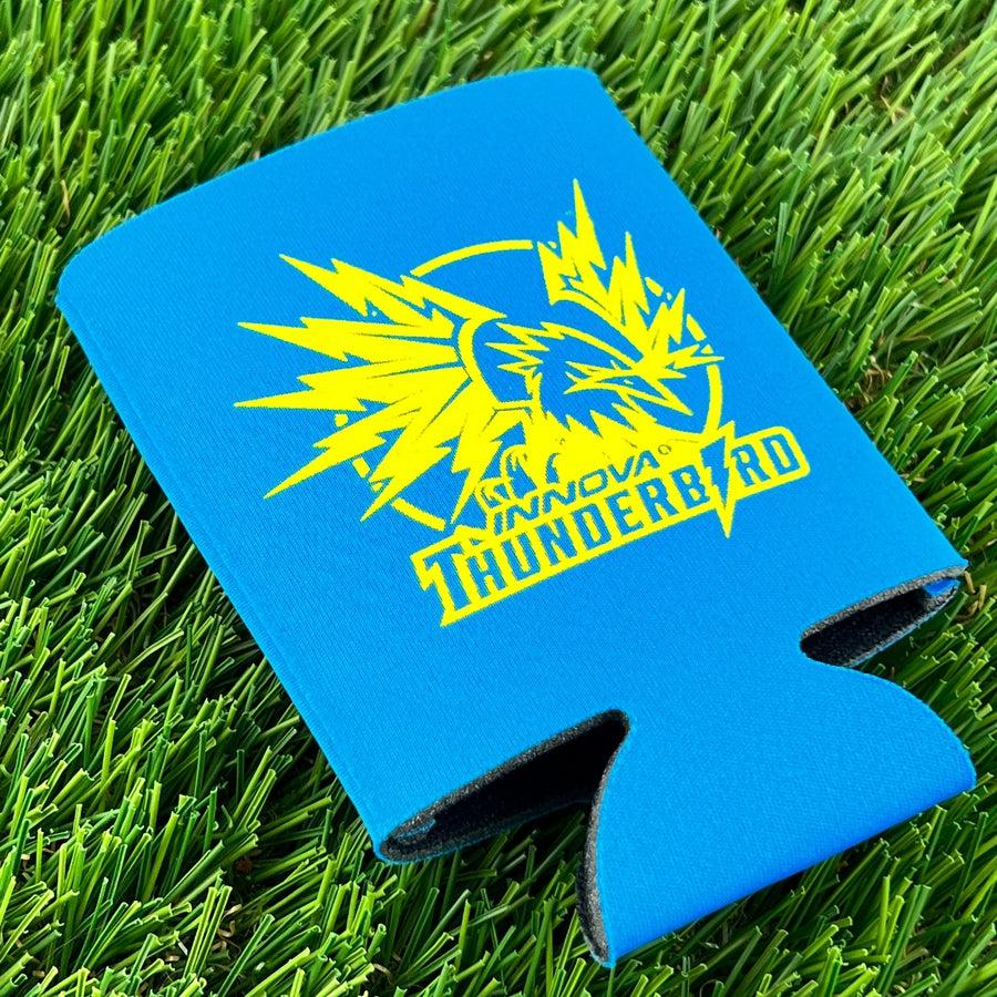 Bright blue Innova Thunderbird coozie with a yellow stylized bird graphic and bold "Thunderbird" text.