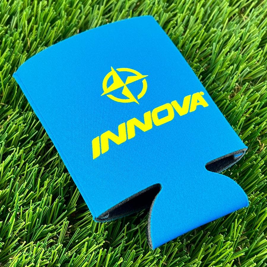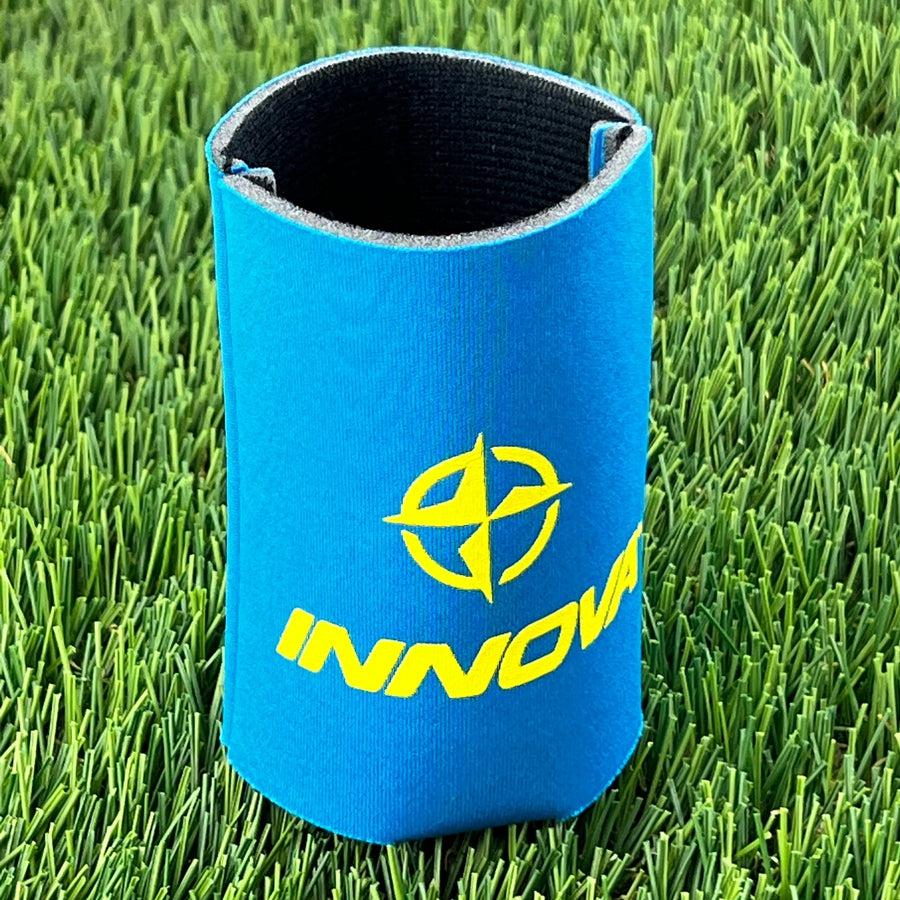 Blue innova coozie with a yellow compass logo and wordmark, featuring black neoprene interior.