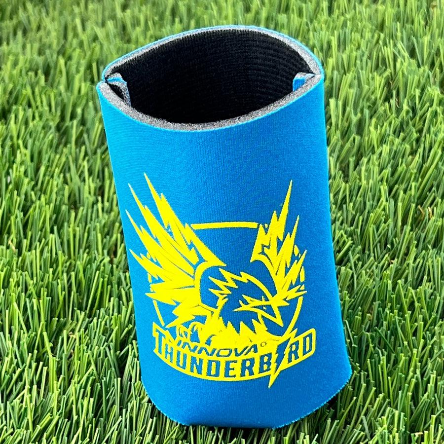 Blue foam innova thunderbird coozie with a yellow thunderbird logo and text, resting on green artificial turf.