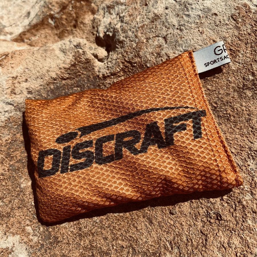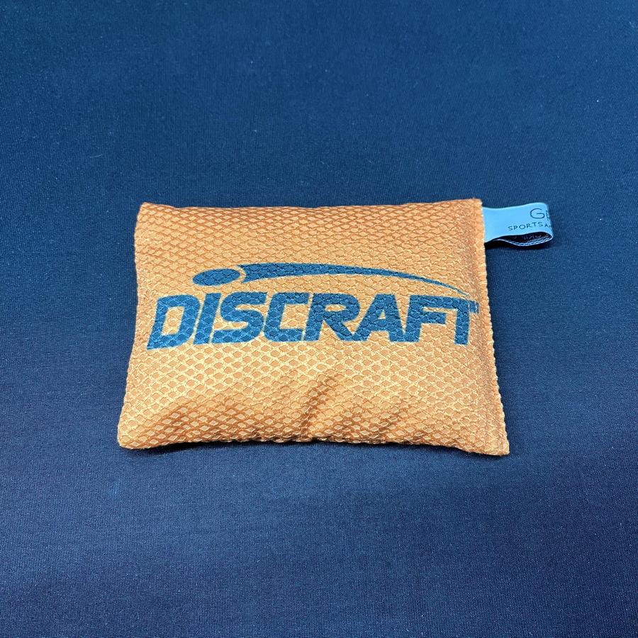 A soft, silky-feel Discraft grip sack made by Grip Sportsack/GripCo, featuring a smooth bead-style filling and moisture-absorbing performance without chalk or dust.