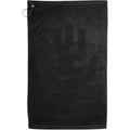 Red cotton Handeye Supply Company disc golf towel with a prominent black hand logo and a white carabiner clip.