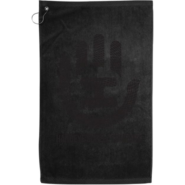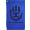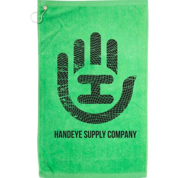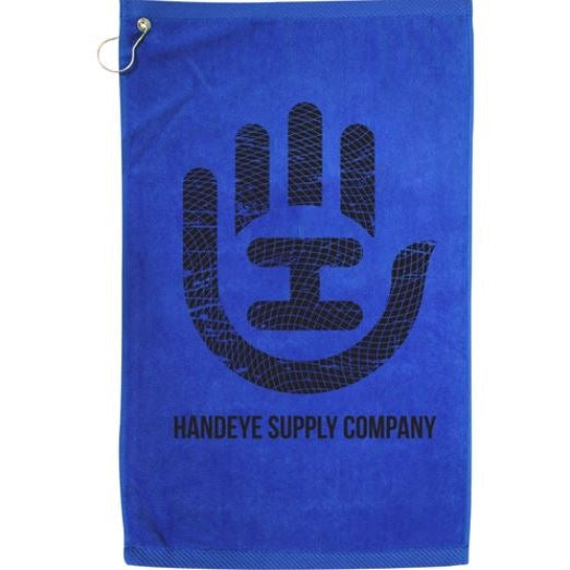 Bright blue Handeye Supply Company disc golf towel featuring a large black hand logo and a hanging loop.