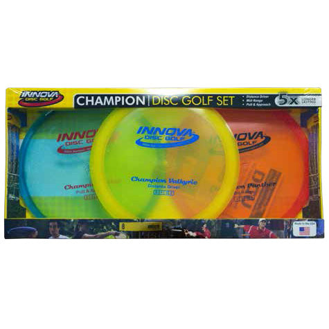 Everything you need to start playing today! Not only does this get you playing immediately but it will keep you in the game longer, this is due to all the discs being made of the high quality champion plastic. Champion plastics are built to be extremely tough and deliver the performance you expect from an Innova disc. Higher quality discs than you would typically see in a starter set, but this is an excellent buy for new players, beginners, and intermediates alike. Everyone has to start somewhere, why not start out with three champions!
