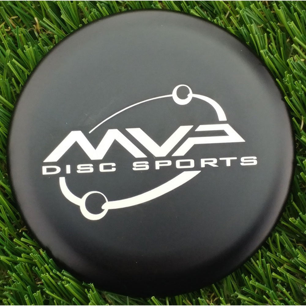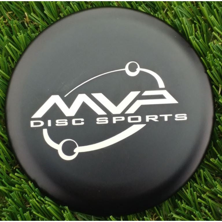 Round black MVP Disc Sports metal marker with an orbit logo featuring white letters and rings.