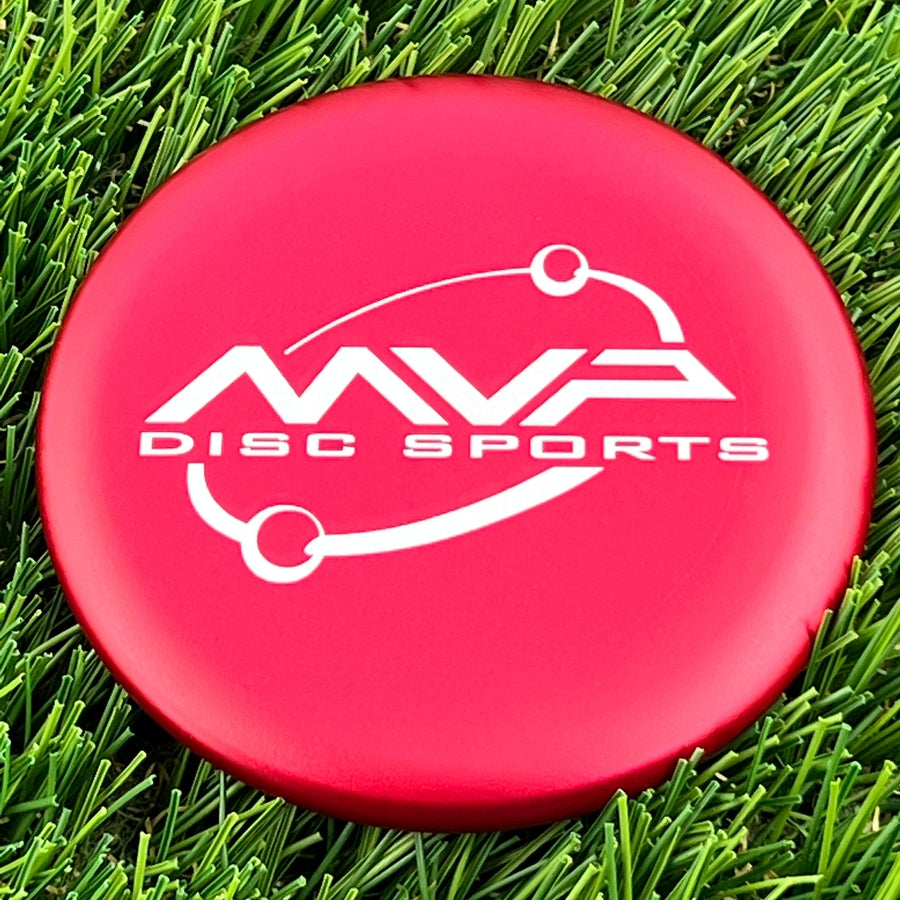 Round red metal MVP Disc Sports Orbit logo disc golf driver with a white brand logo.